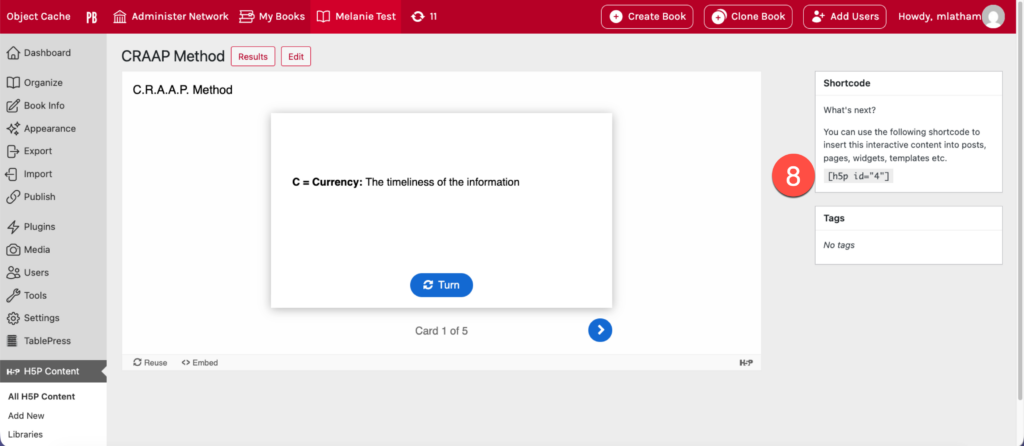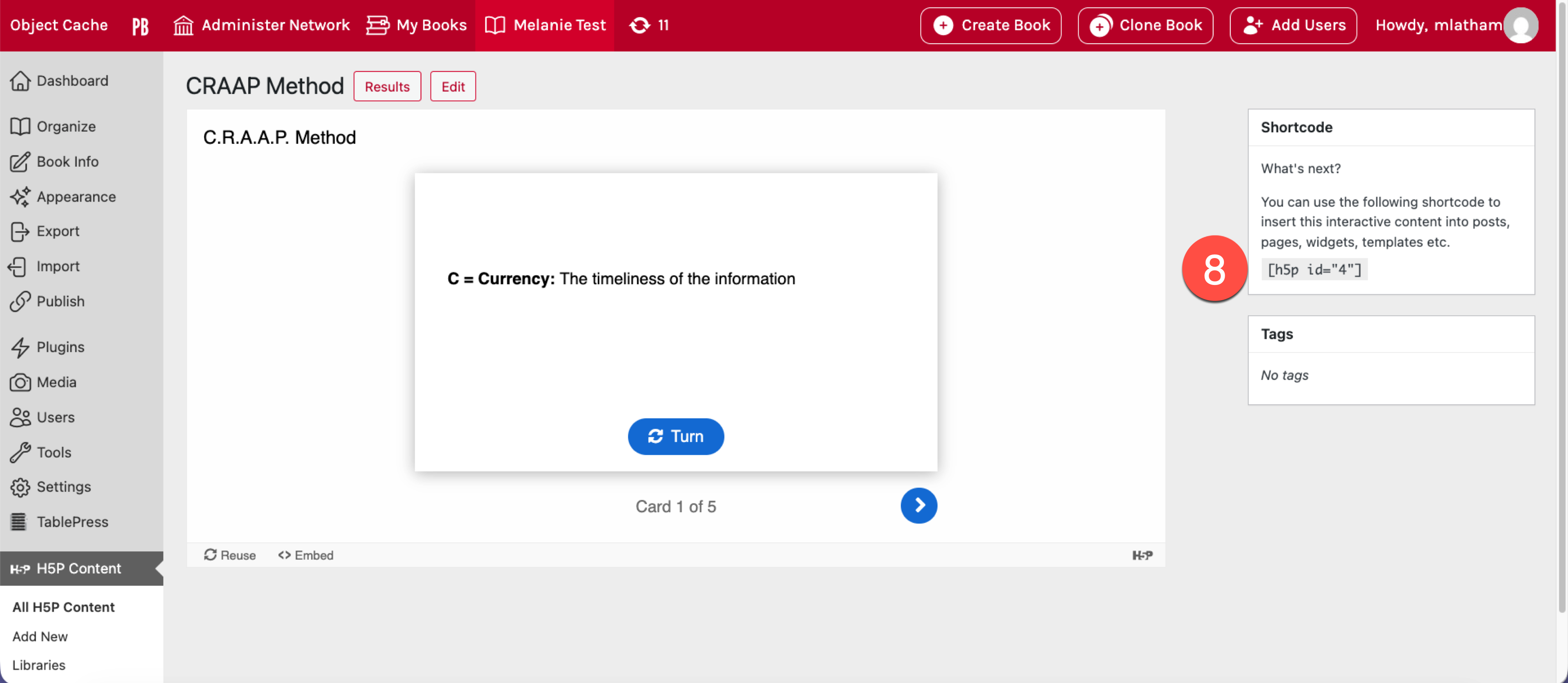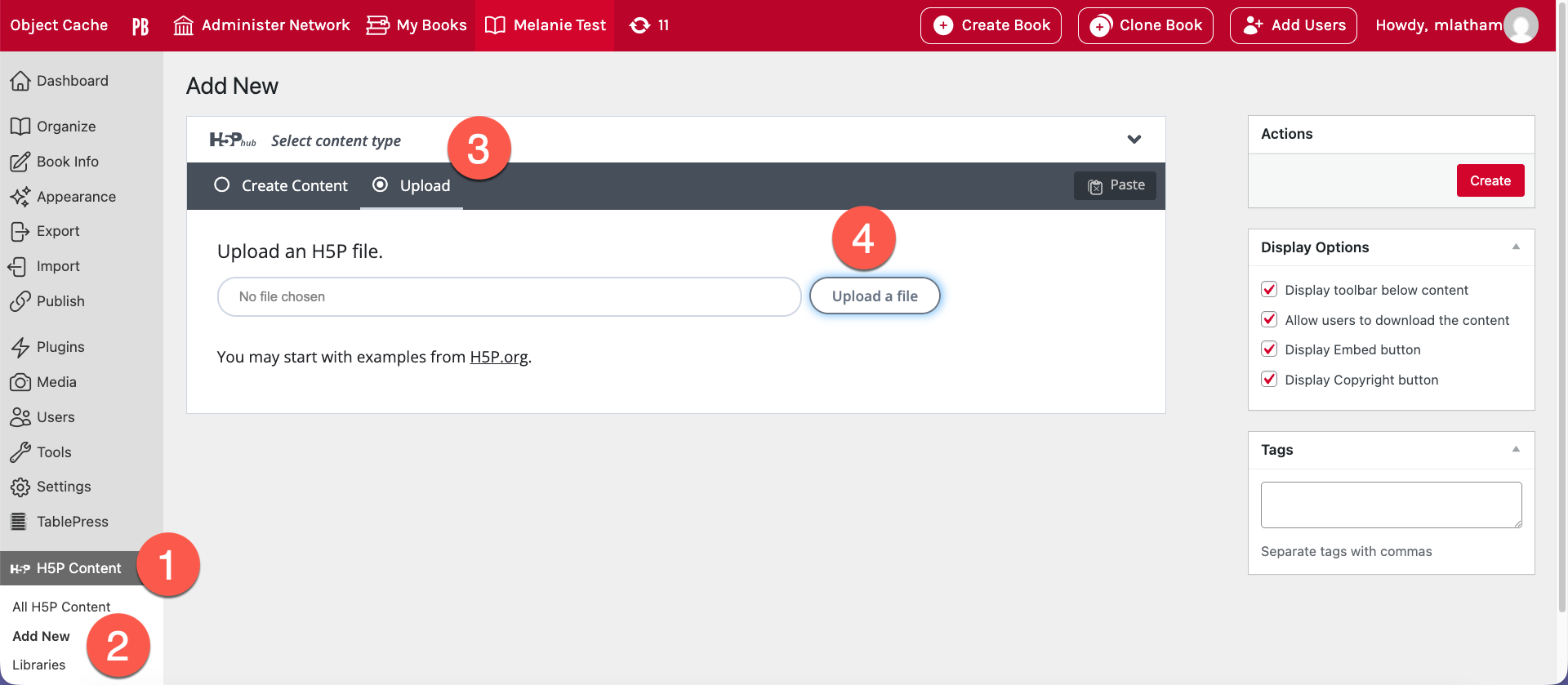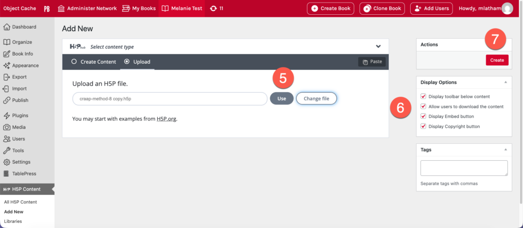 Adding H5Ps to Pressbooks makes the content more interactive and allows learners to practice what they are learning to help them better retain it. If you’ve created an H5P file in Lumi or another platform, you can upload it directly to Pressbooks and embed it on any page. The instructions below walk you through the upload process.